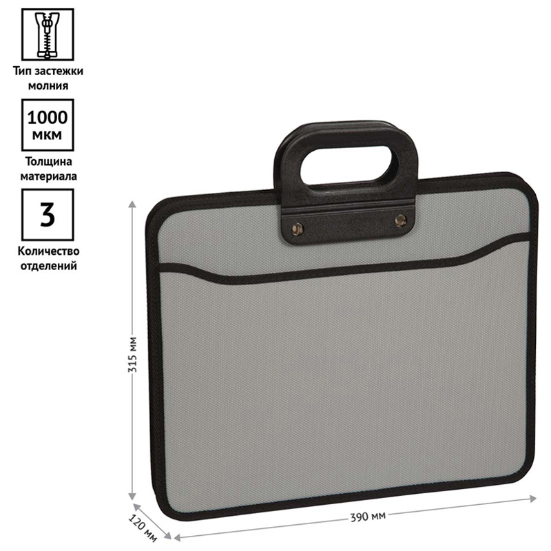 Папка-портфель 3 отделения OfficeSpace, формата А4+, на молнии, серого цвета. Предназначен для транспортировки документов, бумаг и различных предметов. Увеличенный размер позволяет размещать документы и папки А4 форматов. Портфель содержит два внутренних отделения, закрывающихся на молнию, и одно внешнее. Внутри портфеля есть четыре кармана-сетки и два тканевых кармана для мелких предметов. Надежные усиленные пластиковые ручки. Максимальное расширение портфеля составляет 120 мм. Цвет серый. Индивидуальная упаковка в пакет.