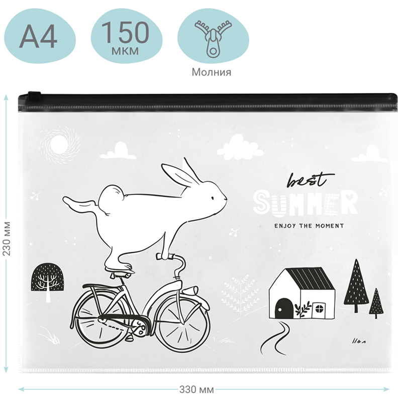 Папка-конверт на молнии MESHU Best summer – стильный помощник, который подойдет для хранения тетрадей, блокнотов, ежедневников форматов А4 и А5. Папка формата А4 вмещает до 60 листов стандартной офисной бумаги. Изготовлена из прочного полипропилена толщиной 150 мкм с гладкой фактурой. Размер горизонтальной папки – 330*230 мм. Папка имеет герметичную застежку-зиплок чёрного цвета, которая защищает документы от механических повреждений, пыли и влаги. Милый и стильный чёрно-белый рисунок с зайчиком понравится всем любителям современных дизайнов.<br/>• Вместимость, в листах: 60;<br/>• Формат: А4;<br/>• Цвет: прозрачный с рисунком;<br/>• Материал: пластик.