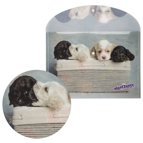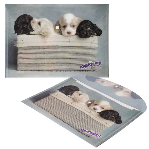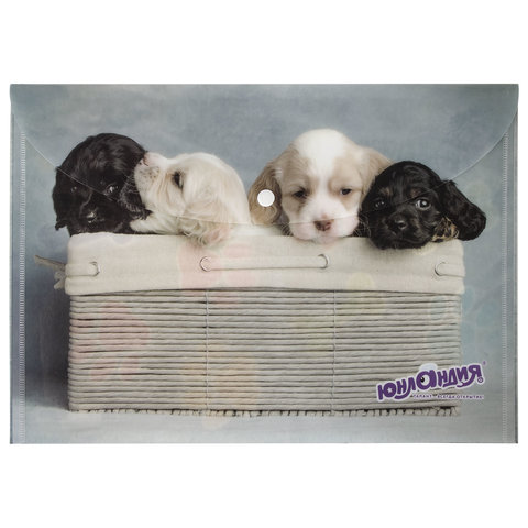 Папка-конверт формата А4 из плотного пластика в 160 мкм с полноцветной печатью. Закрывается на защелку-кнопку, что способствует удобству для частого использования и обеспечивает быстрый доступ к бумагам. Вместительность до 100 листов поможет хранить или взять с собой необходимые документы. Гладкая фактура с полноцветным рисунком щенков вызовет улыбку у ребенка и взрослого. Папка ЮНЛАНДИЯ практична в использовании и надежно защитит документы и сбережет их от повреждений, пыли и влаги.