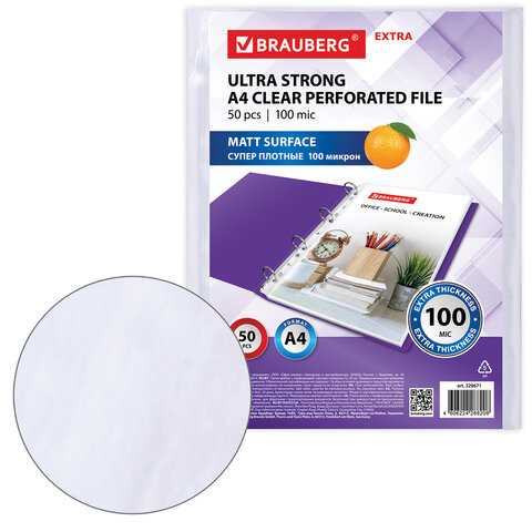 Перфорированные папки-файлы BRAUBERG "EXTRA 1000" предназначены для хранения документов в папке с любым кольцевым механизмом или скоросшивателем.