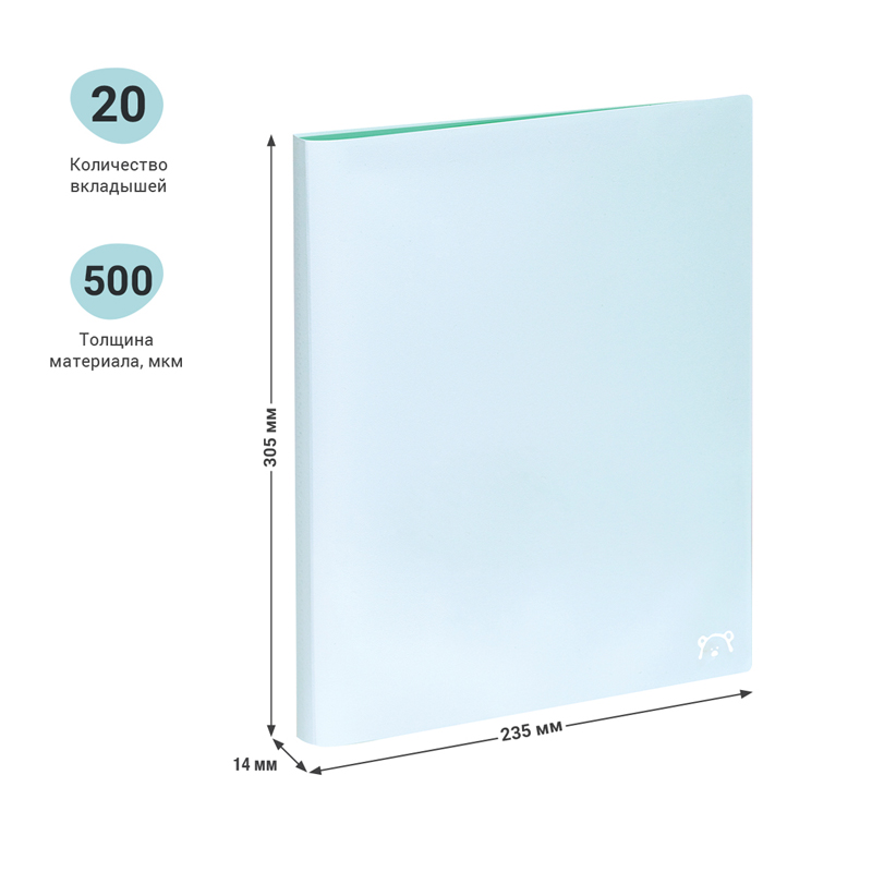 Папка с 20 вкладышами MESHU серия Dew формата А4 – это стильный аксессуар в современном дизайне нежного зеленого цвета привлекает внимание матовой, приятной на ощупь, фактурой и милым элементом в виде голографического логотипа. Папка размером 305*235*14 мм изготовлена из плотного пластика толщиной 0,5 мм с текстурой «песок» и предназначена для транспортировки, упорядочивания и хранения бумаг. Ширина корешка 14 мм, тип скрепления: термосварка. Вкладыши защищают документы от повреждений и загрязнений. Индивидуальная упаковка в пакет. Создать эффектный канцелярский набор в дополнение к папке помогут другие товары MESHU из серии Dew.