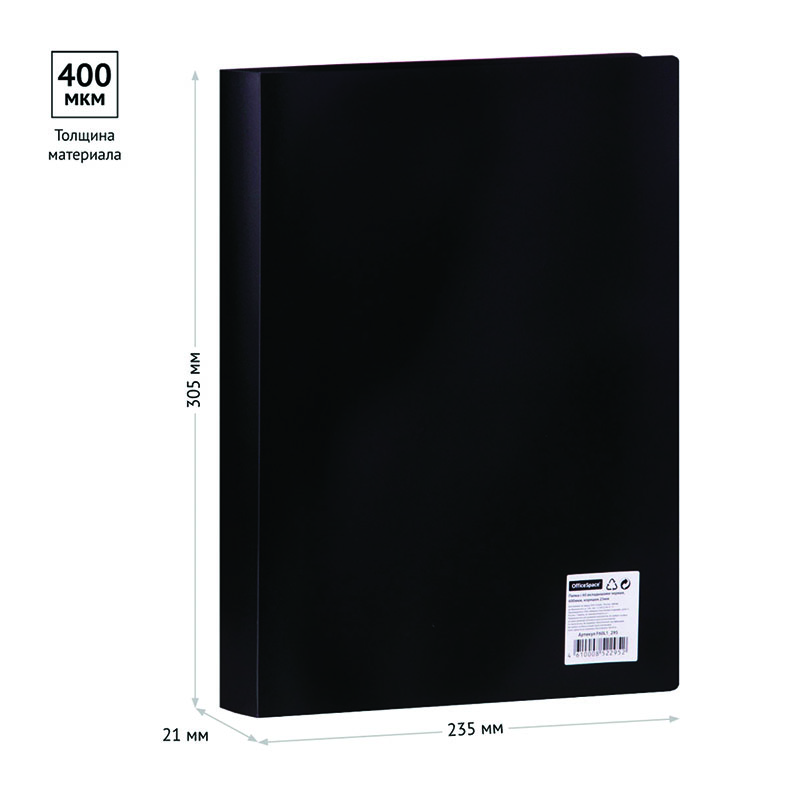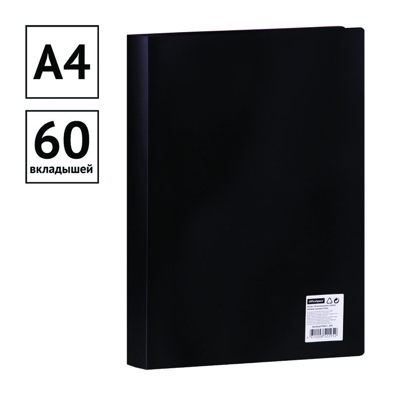 Папка с вкладышами OfficeSpace, 21мм, 400мкм, чёрная, содержит 60 вкладышей, которые надежно защищают листы от повреждений. Размер составляет 310*228мм. Папка с прозрачными файлами рекомендуется для хранения материалов и документов, требующих упорядоченности и наглядного обзора. Вложенным документам не требуется перфорация дыроколом. <br/>• Размер: 310*228мм;<br/>• Формат: А4; <br/>• Цвет: чёрный;<br/>• Ширина корешка: 21мм.