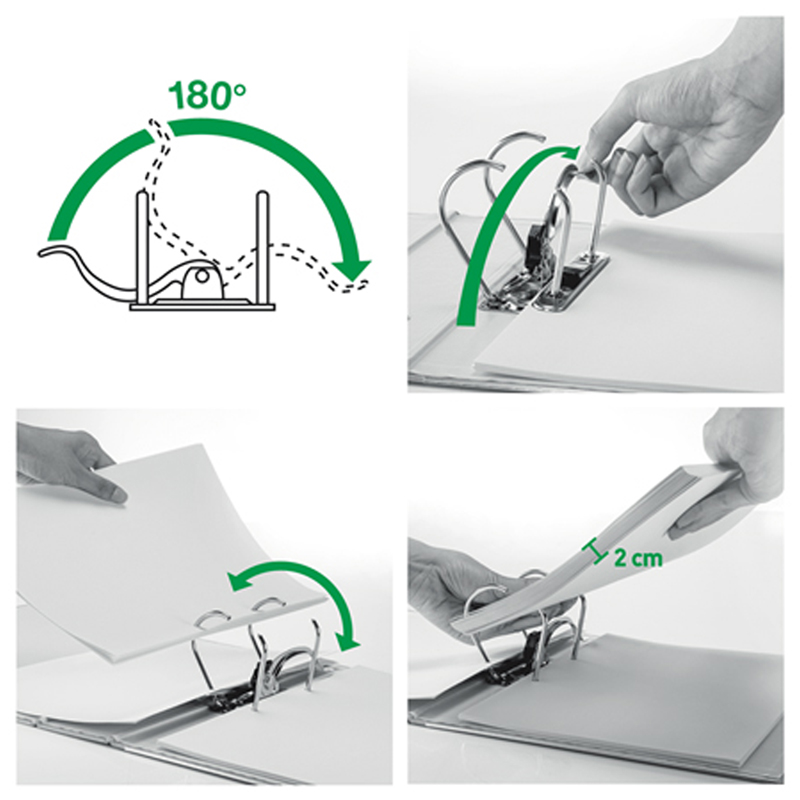 Уникальный запатентованный механизм с раскрытием рычага на 180°: раскрытие на 50% шире, заполнение на 20% быстрее<br/>— Высокопрочное полипропиленовое покрытие и оклейка ламинированной бумагой изнутри для продления срока службы<br/>— Отверстие-захват, прорези на лицевой обложке и металлическая окантовка уголков для безопасного хранения и удобства в обращении<br/>— Карман на корешке позволяет заменять этикетки, что делает маркировку более удобной<br/>— Вместимость: 600 листов A4 (80 г/м²)