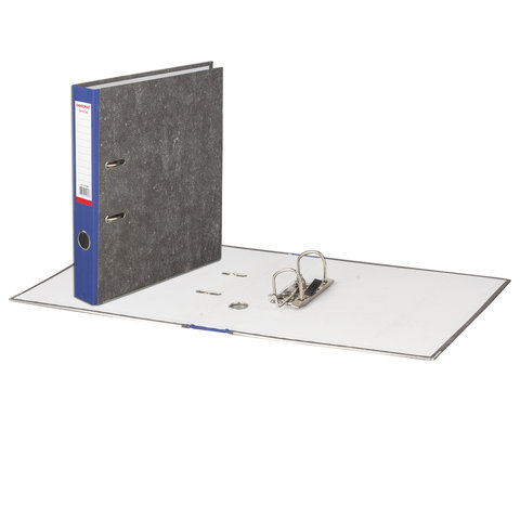 Папка формата А4 с вертикальной ориентацией изготовлена из высококачественного износоустойчивого картона с покрытием под "мрамор". Ширина корешка в 50 мм позволяет разместить до 350 листов. Нижние края папки защищены металлическими уголками, что увеличивает срок службы в 2 раза. Прорези для колец на внешней крышке позволяют оставаться папке закрытой даже при большом количестве бумаг, а надежный арочный механизм легко справляется с ежедневными нагрузками. Синий корешок снабжен этикеткой для маркировки содержимого, что позволяет структурировать информацию.