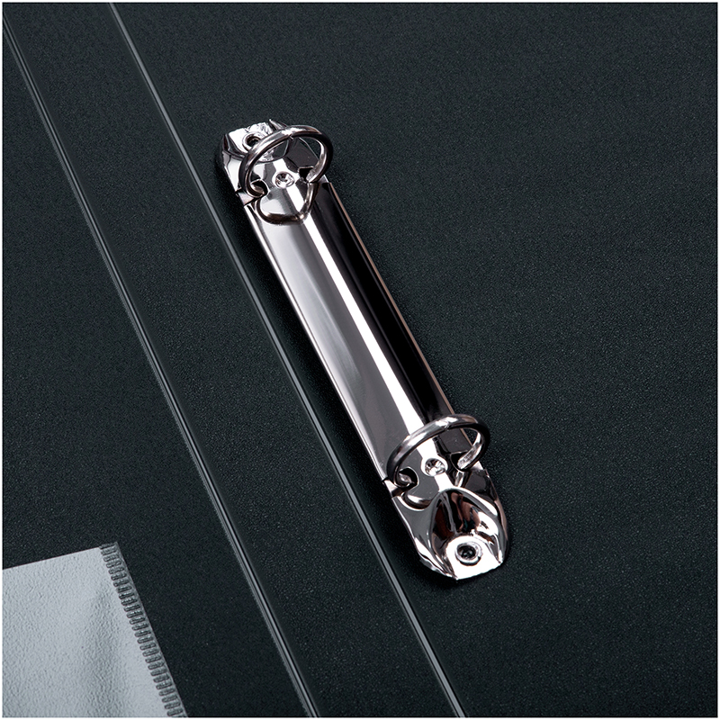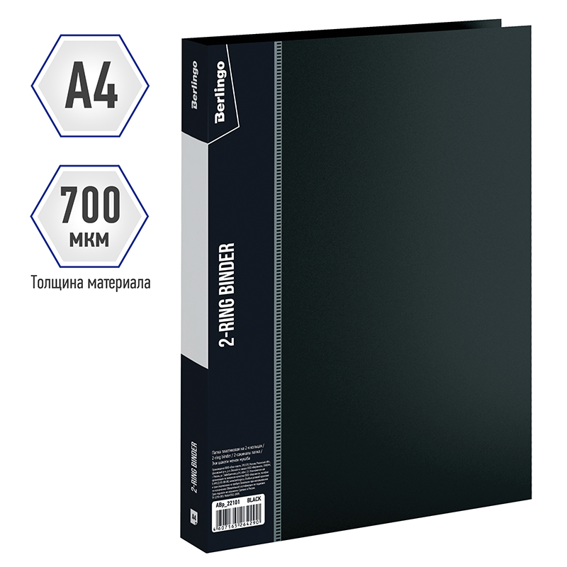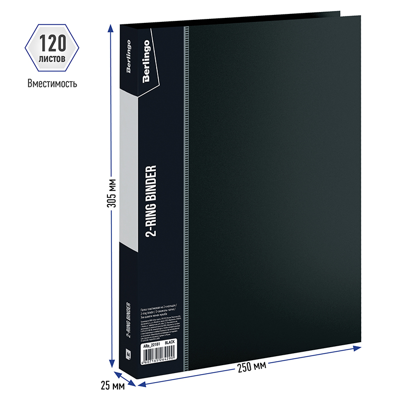 Папка на 2 кольцах Berlingo серии Standard размером 305*250*25 мм изготовлена из плотного пластика толщиной 0,7 мм с текстурой «песок». Вместимость папки – 120 листов, ширина корешка – 25 мм. Кольцевой механизм с 2 кольцами диаметром 17 мм надежно держит перфорированные документы и документы, помещенные в файлы-вкладыши. На корешке и внутренней стороне папки имеется карман. Папка формата А4 – это функциональный аксессуар для работы и учебы, который выполнен в классическом черном цвете и предназначен для транспортировки, упорядочивания и хранения бумаг. Индивидуальная упаковка в пакет.<br/>• Вместимость, в листах: 120;<br/>• Формат: А4;<br/>• Цвет: черный;<br/>• Ширина корешка: 25 мм.