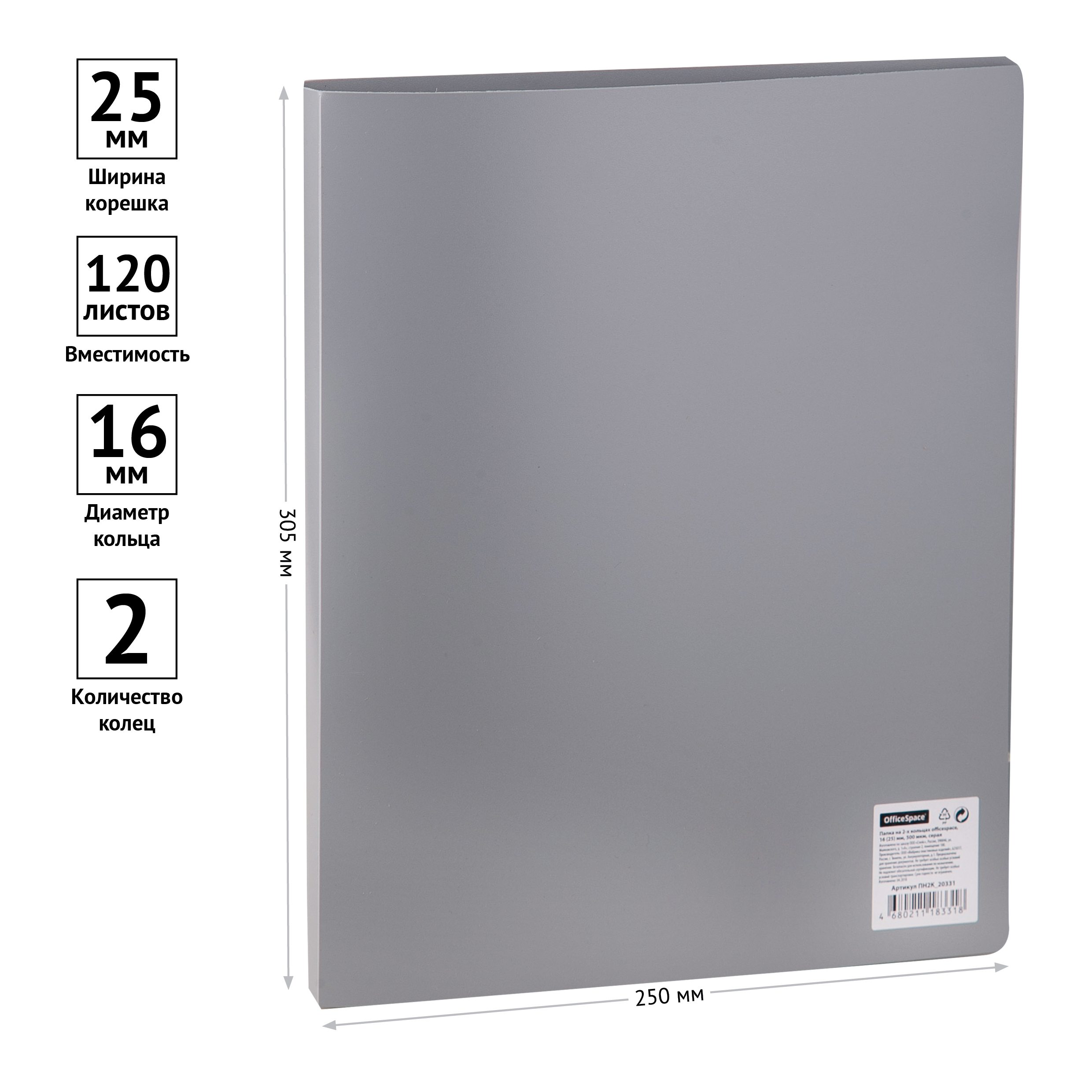 Папка на 2 кольцах OfficeSpace, 25мм, 500 мкм, серая, предназначена для длительного или временного хранения перфорированых документов формата А4, изготовлена из плотного пластика. Размер составляет 305*250мм. Кольцевой механизм надежно держит документы. В ассортименте представлены классические офисные цвета. Допустима влажная обработка. <br/>• Размер: 305*250мм;<br/>• Формат: А4; <br/>• Цвет: серый;<br/>• Вместимость в листах: 120шт;<br/>• Ширина корешка: 25мм.