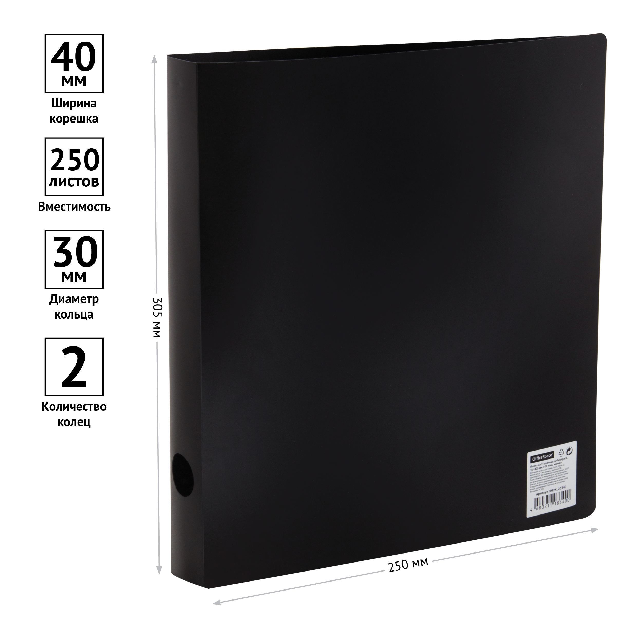 Папка на 2 кольцах OfficeSpace, 40мм, 500мкм, чёрная, предназначена для длительного или временного хранения перфорированых документов формата А4, изготовлена из плотного пластика. Размер составляет 305*250мм. Кольцевой механизм надежно держит документы. В ассортименте представлены классические офисные цвета. Допустима влажная обработка. <br/>• Размер: 305*250мм;<br/>• Формат: А4; <br/>• Цвет: чёрный;<br/>• Ширина корешка: 40мм.