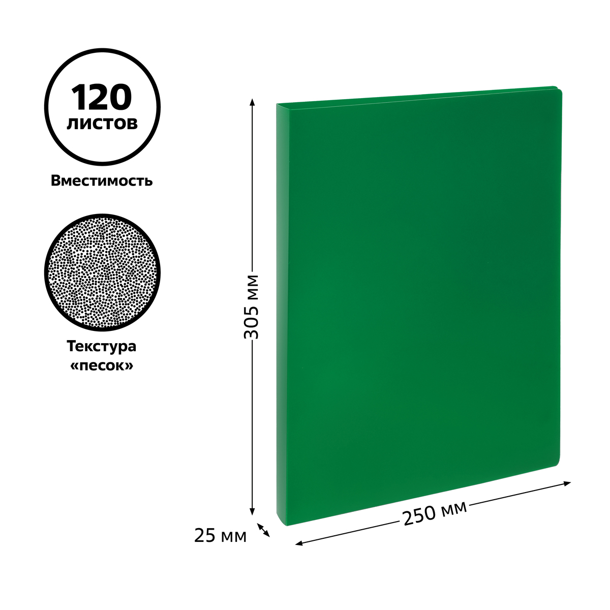 Папка на 2 кольцах «СТАММ» предназначена для хранения перфорированных документов формата А4. Цвет папки – зелёный. Изготовлена из качественного полипропилена плотностью 500 мкм с текстурой «песок». Размер изделия составляет 310*250 мм. Ширина корешка 25 мм позволяет вмещать в папку до 120 листов. Кольцевой механизм, состоящий из 2 колец диаметром 16 мм, надежно держит документы. Папка упакована в индивидуальный пакет. <br/>• Размер: 310*250 мм;<br/>• Толщина материала: 500 мкм;<br/>• Формат: А4;<br/>• Цвет: зеленый;<br/>• Вместимость в листах: до 120 листов;<br/>• Ширина корешка: 25 мм.