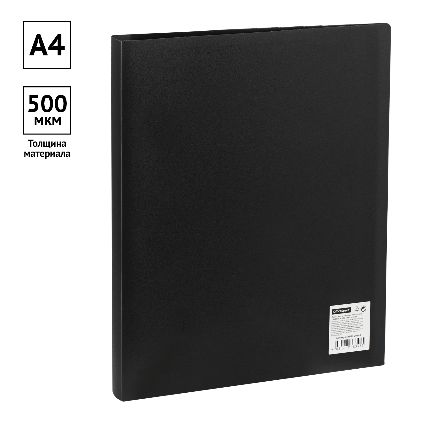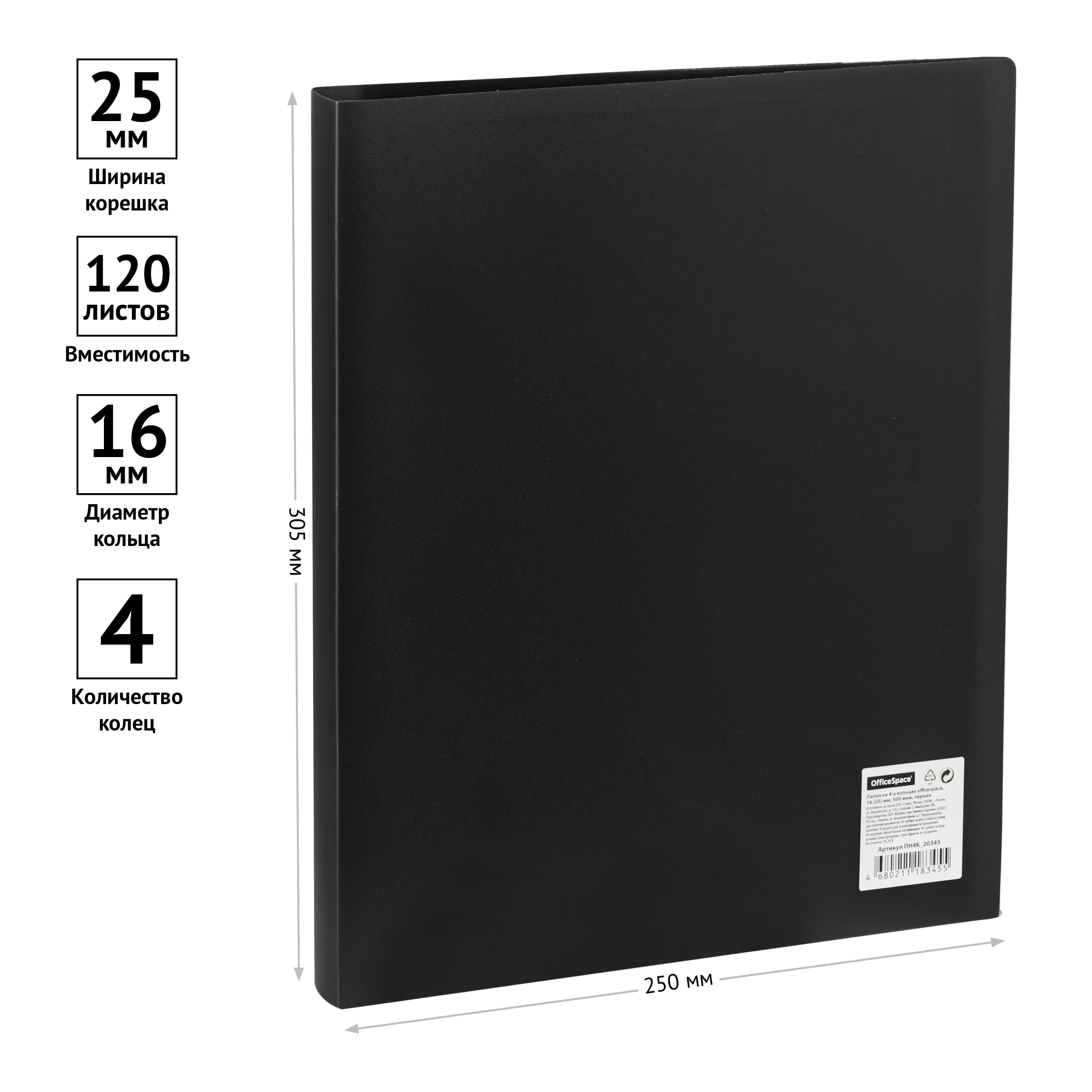 Папка на 4-х кольцах OfficeSpace, 25мм, 500мкм, чёрная, предназначена для длительного или временного хранения перфорированых документов формата А4, изготовлена из плотного пластика. Размер составляет 305*250мм. Кольцевой механизм надежно держит документы. В ассортименте представлены классические офисные цвета. Допустима влажная обработка. <br/>• Размер: 305*250мм;<br/>• Формат: А4; <br/>• Цвет: чёрный;<br/>• Ширина корешка: 25мм.