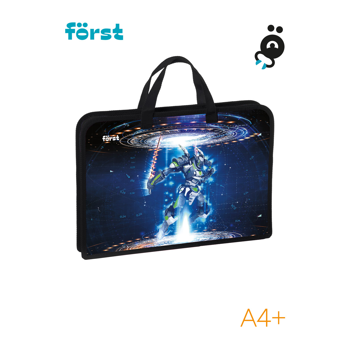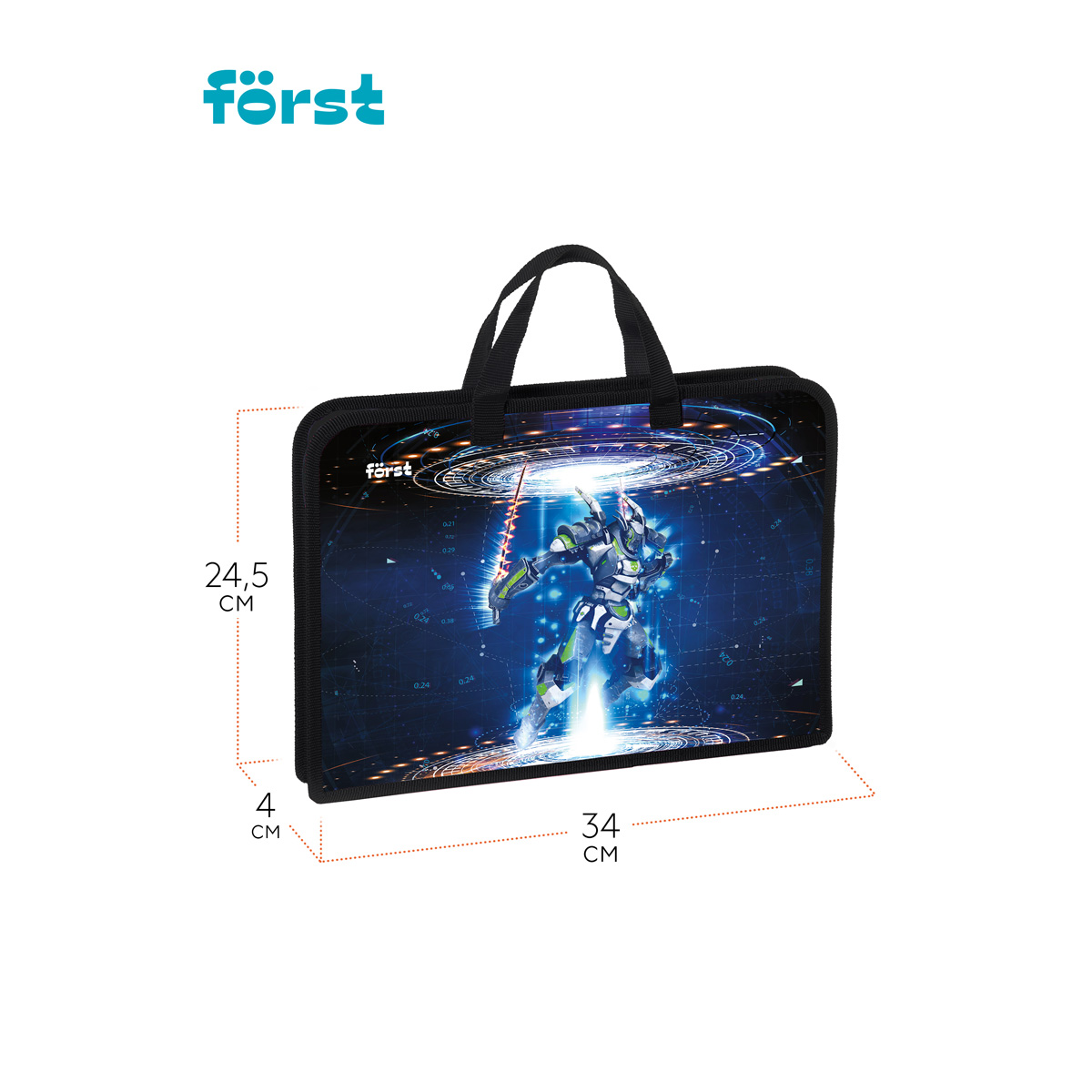 Школьная папка Först серии Neo future с одним отделением помогает поддерживать аккуратный внешний вид тетрадей, альбомов и учебных пособий. Формат изделия — А4 (340*245*40 мм). Папка изготовлена из качественного пластика, который защищает содержимое от влаги, грязи и замятия. Края укреплены тканевой окантовкой. Застёжка-молния расположена по верхнему краю изделия. Ручки сделаны из тесьмы, поэтому отличаются прочностью и не порвутся в неподходящий момент. Дизайн папки с роботом из будущего понравится мальчику. <br/>• Формат: А4;<br/>• Ширина: 40 мм;<br/>• Материал: пластик;<br/>• Количество отделений: 1;<br/>• Вид ручек: тесьма;<br/>• Тип застёжки: молния.