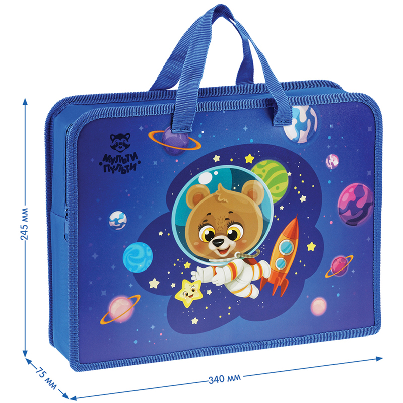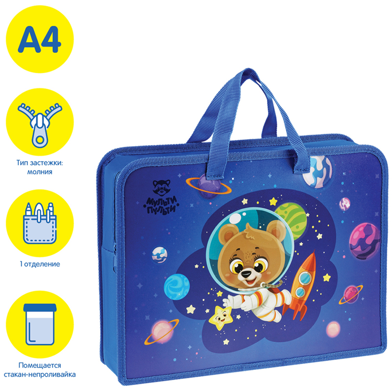 Папка с ручками на молнии «Мульти-Пульти» Spaceman формата А4 предназначена для удобного хранения листов А4, тетрадей, альбомов для рисования. Модель изготовлена из качественного пластика, который защищает содержимое папки от влаги. Удобные ручки позволяют взять ее в школу, детский сад. Широкая боковая часть (75 мм) увеличивает вместимость папки, благодаря чему помещается стакан-непроливайка. Для детей старше 3-х лет.<br/>• Формат: А4;<br/>• Ширина: 75 мм;<br/>• Материал: пластик/текстиль;<br/>• Количество отделений: 1;<br/>• Вид ручек: тесьма;<br/>• Тип застёжки: молния;<br/>• Цвет: рисунок.