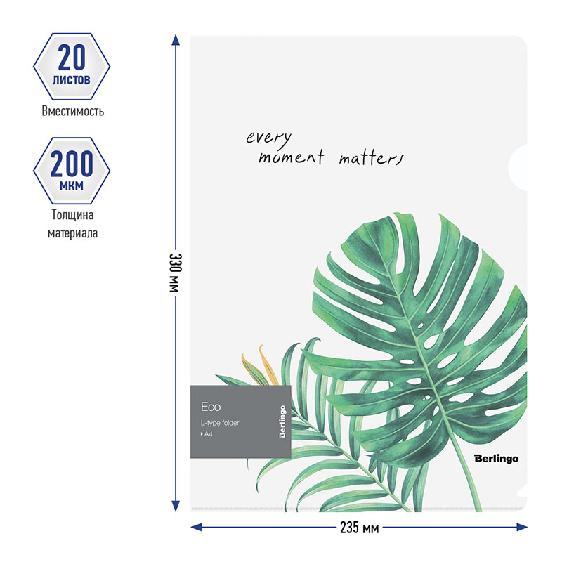Папка-уголок пластиковая Berlingo "Eco" формата А4 с рисунком. Удобная полукруглая вырубка с лицевой стороны. Быстрый доступ к документам. Изготовлена из высококачественного полипропилена с матовой текстурой поверхности "апельсиновая корка", на которой не видно отпечатков пальцев и мелких царапин. Предназначена для хранения документов. Толщина 200мкм. Вмещает до 20 листов. Упаковка в прозрачный пакет по форме на 12шт. Индивидуальный штрих-код на каждой папке-конверте на съемном стикере с информацией.