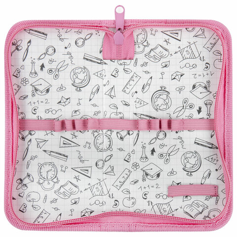 Внутри пенала прочные резинки для канцелярских принадлежностей, внутренняя часть выполнена из картона с глянцевой ламинацией с узором.