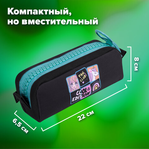 Пенал выделяется среди аналогов объемной "тракторной" застежкой-молнией с увеличенным бегунком. Имеет оптимальный размер для размещения в нем не только канцелярских принадлежностей и принадлежностей для творчества, но и повседневных мелочей, аксессуаров, таким образом может выполнять роль универсального несессера, который можно всегда взять с собой.
