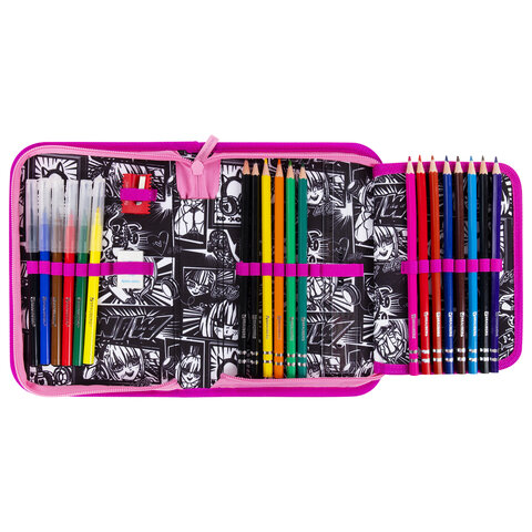 Материал снаружи и внутри – полиэстер с цветной печатью, ярким дизайном. Основа пенала – плотный картон. Такая конструкция отличается износостойкостью и прочностью, что поможет защитить канцелярские принадлежности от повреждений.