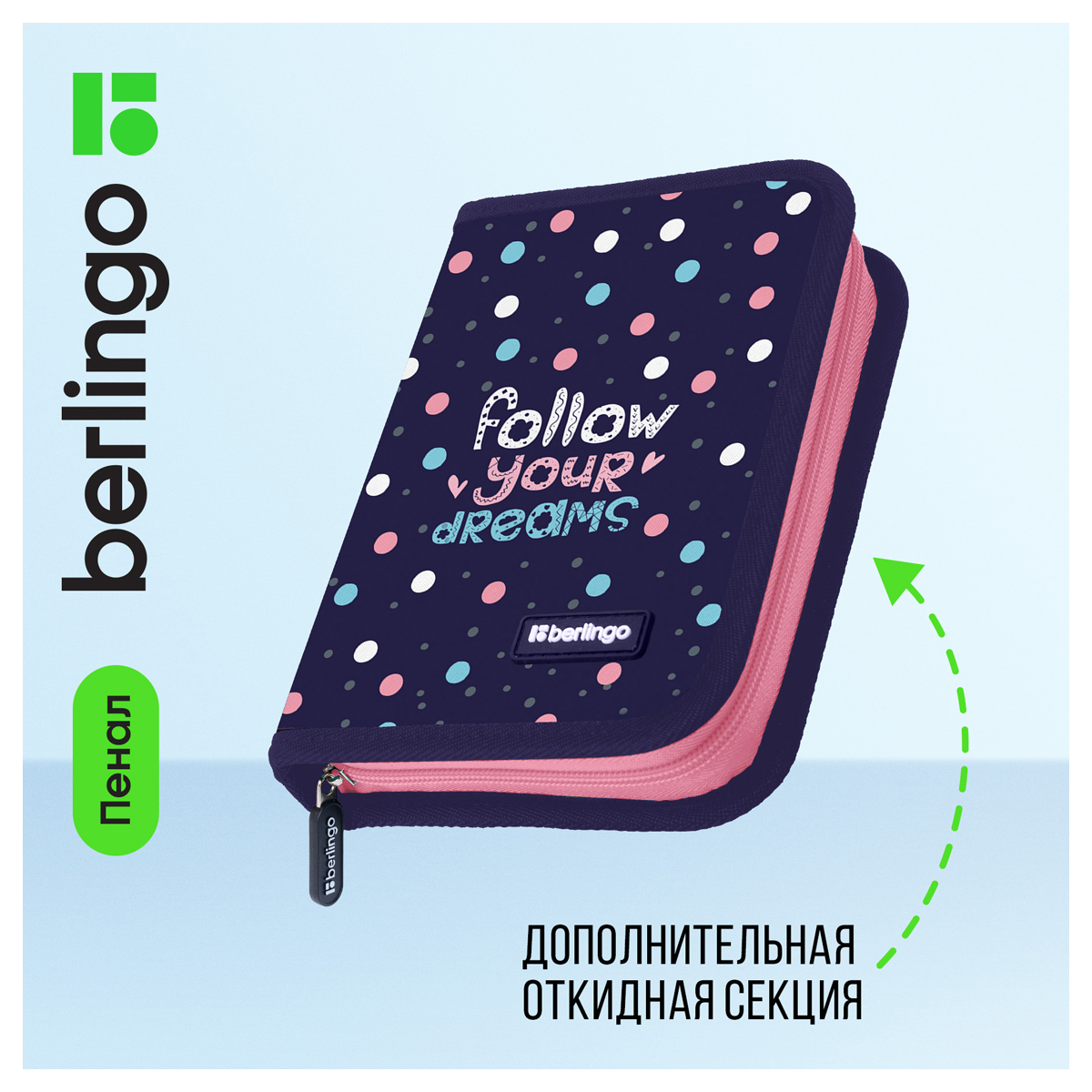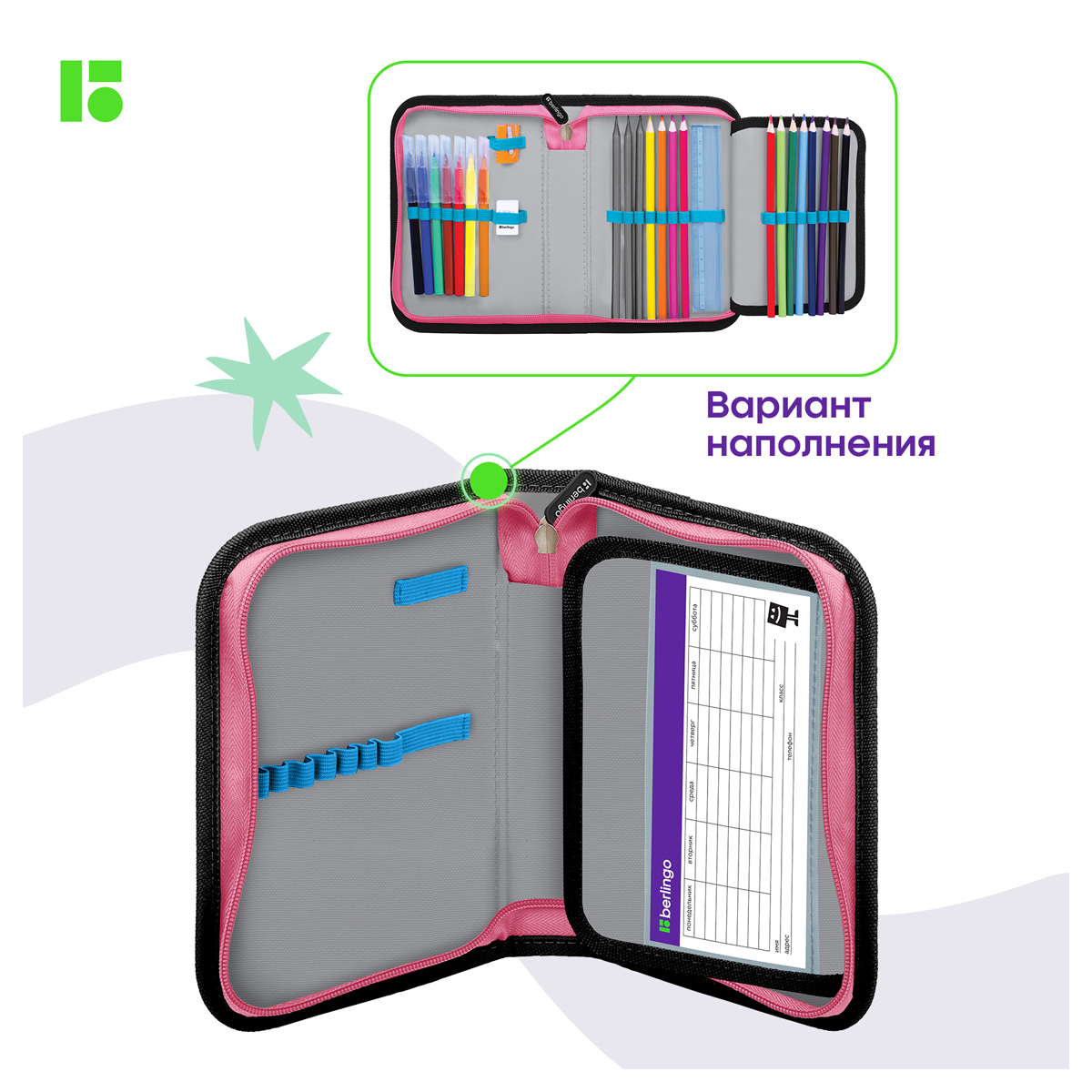 Каркасный пенал Berlingo помогает школьнику хранить канцелярские принадлежности в одном месте. Изделие размером 200*140*40 мм не занимает много места в рюкзаке. В одно отделение помещается 25 предметов. За счёт креплений-резиночек для канцтоваров внутри пенала легко поддерживать порядок. Одна откидная планка увеличивает вместимость изделия и позволяет всегда держать расписание уроков перед глазами. Благодаря крупному бегунку ребёнку удобно открывать пенал на молнии. <br/>Лицевая поверхность сделана из износостойкого полиэстера, а внутренняя – из текстурного ПВХ. Пенал упакован в индивидуальный пакет с ярким тэгом. Поставляется без наполнения.