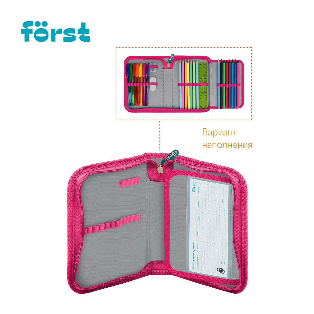 Каркасный пенал Först помогает школьнику хранить канцелярские принадлежности в одном месте. Изделие размером 200*140*40 мм не занимает много места в рюкзаке. В одно отделение помещается 25 предметов. За счёт креплений-резиночек для канцтоваров внутри пенала легко поддерживать порядок. Одна откидная планка увеличивает вместимость изделия и позволяет всегда держать расписание уроков перед глазами. Благодаря крупному резиновому бегунку ребёнку удобно открывать пенал на молнии. <br/>Лицевая поверхность сделана из износостойкого полиэстера с принтом, а внутренняя – из текстурного ПВХ. Пенал упакован в индивидуальный пакет с ярким тэгом. Поставляется без наполнения.