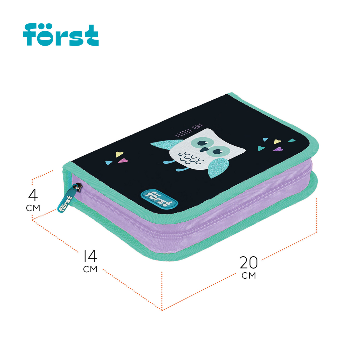 Каркасный пенал Först помогает школьнику хранить канцелярские принадлежности в одном месте. Изделие размером 200*140*40 мм не занимает много места в рюкзаке. В одно отделение помещается 25 предметов. За счёт креплений-резиночек для канцтоваров внутри пенала легко поддерживать порядок. Одна откидная планка увеличивает вместимость изделия и позволяет всегда держать расписание уроков перед глазами. Благодаря крупному резиновому бегунку ребёнку удобно открывать пенал на молнии. <br/>Лицевая поверхность сделана из износостойкого полиэстера с принтом, а внутренняя – из текстурного ПВХ. Пенал упакован в индивидуальный пакет с ярким тэгом. Поставляется без наполнения.