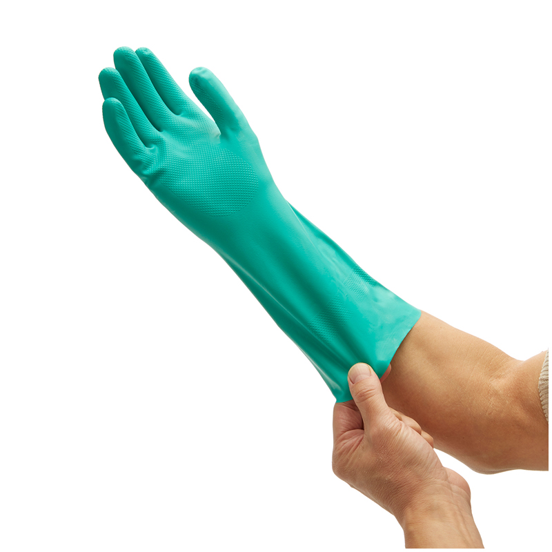С длинной манжетой и рельефным покрытием на пальцах. Защита рук от химического воздействия масел, смазки, кислот, едких веществ и растворителей. Основные преимущества: уникальная формула Nitrile обеспечивает превосходную защиту от химикатов и долговечность, не содержат натурального латекса, что снижает аллергических реакции Типа 1, специальное напыление, облегчающая надевание и повышает комфорт использования, рельефная поверхность ладони и кончиков пальцев обеспечивают отличный захват во влажной и сухой среде, устойчивы к многочисленным распространенным химикатам, включая масла и растворители, высокая износостойкость и отличная устойчивость к проколам, без ущерба для движений (уровень AQL 0.65 для микропроколов), эргономичный дизайн обеспечивает максимальный комфорт и минимизирует усталость рук