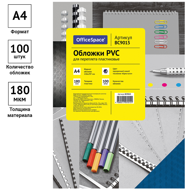 УЦЕНКА - Обложка А4 OfficeSpace "PVC" 300мкм, прозрачный бесцветный пластик, 100л.