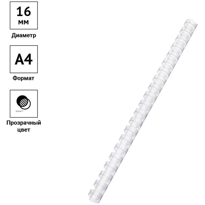Пластиковые пружины OfficeSpace прозрачного цвета диаметром 16мм предназначены для переплета документов. Легко выдерживают многократное раскрытие при необходимости добавить или удалить листы из готовой брошюры. Рекомендуемый объем брошюры при использовании данного диаметра пружины: 101-120 листов.