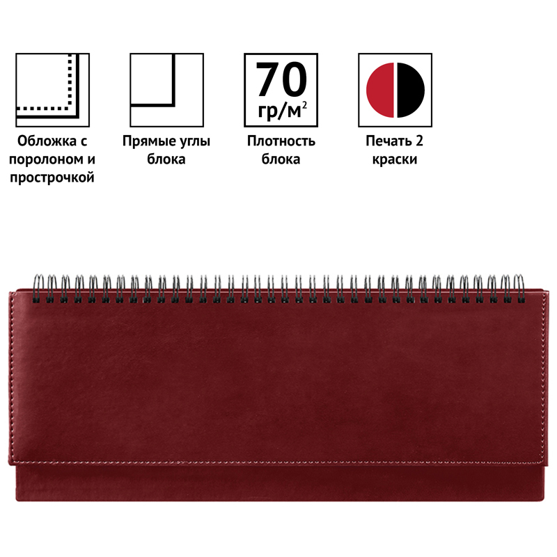 Планинг датированный на 2023 год OfficeSpace серии Winner изготовлен из высококачественной экокожи бордового цвета с гладкой поверхностью, прострочкой по периметру и поролоновой прослойкой. Размер планинга – 330*140 мм. Внутренний блок состоит из 64 листов офсетной бумаги плотностью 70 г/м2, печать блока в 2 краски.