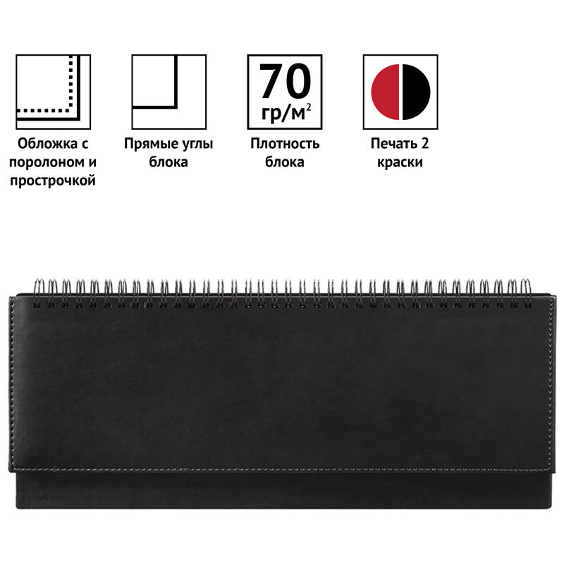 Планинг датированный на 2023 год OfficeSpace серии Winner изготовлен из высококачественной экокожи чёрного цвета с гладкой поверхностью, прострочкой по периметру и поролоновой прослойкой. Размер планинга – 330*140 мм. Внутренний блок состоит из 64 листов офсетной бумаги плотностью 70 г/м2, печать блока в 2 краски.