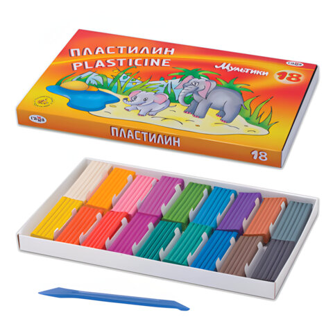 В состав набора входит 18 разноцветных брусков пластилина в картонной упаковке.