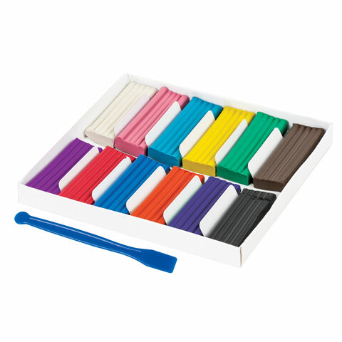 В составе набора 12 цветов: белый, черный, коричневый, желтый, оранжевый, красный, розовый, фиолетовый, сиреневый, голубой, синий, зеленый. Масса набора - 240 г. Поставляется в комплекте со стеком, с помощью которого ребенок может разделять пластилин на части или наносить орнамент на свои поделки. Для детей старше 3-х лет.