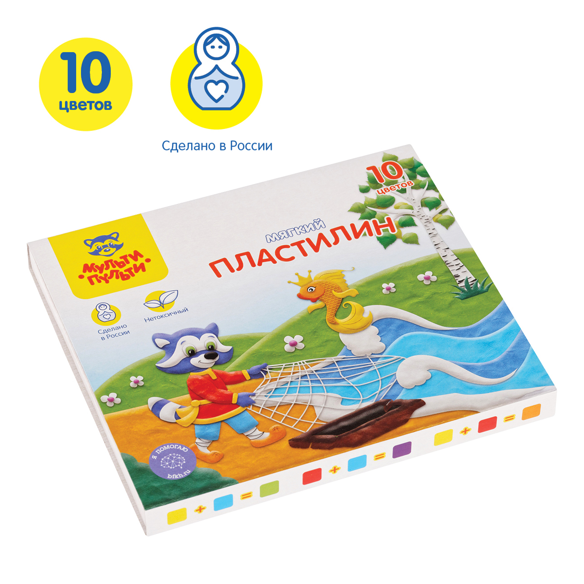 Пластилин «Мульти-Пульти» серии «Енот в сказке» разработан для детей от 3 лет. Специальная формула сделала классический пластилин очень мягким. Он не липнет к рукам и не окрашивает их, хорошо держит форму поделки, не крошится при отрыве, из него можно делать мельчайшие детали. В наборе 10 ярких цветов, которые прекрасно смешиваются и склеиваются друг с другом. Предназначен для изготовления поделок и аппликаций из пластилина. Вес бруска − 12 граммов. Стек в комплекте.