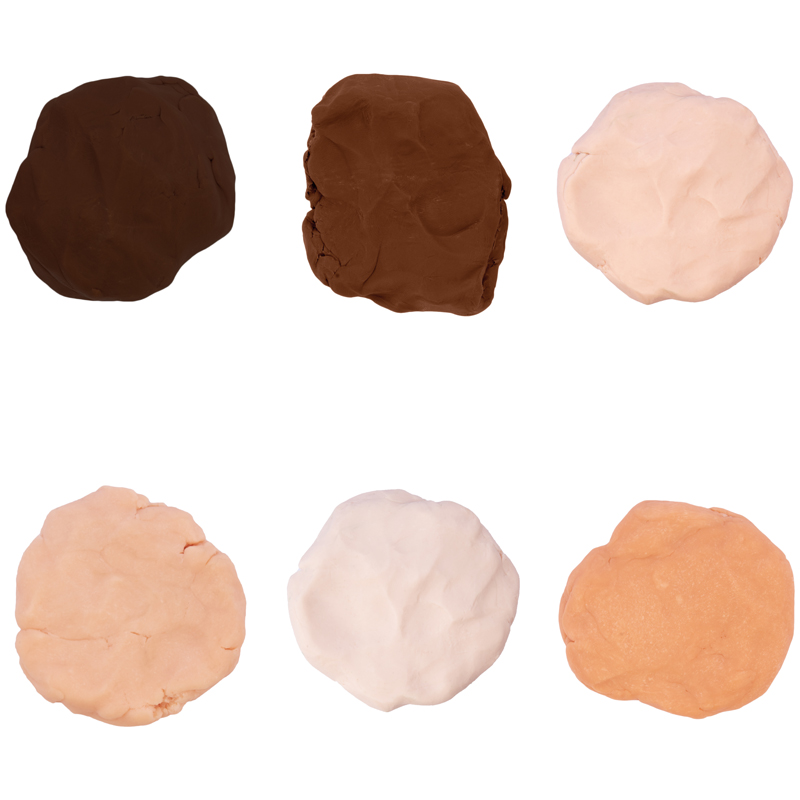 Набор пластилина из шести телесных цветов (светло-бежевый, бежевый, телесный, светло-коричневый, коричневый, темно-коричневый) по 15 грамм в картонной коробке с европодвесом. Страна производства Испания.