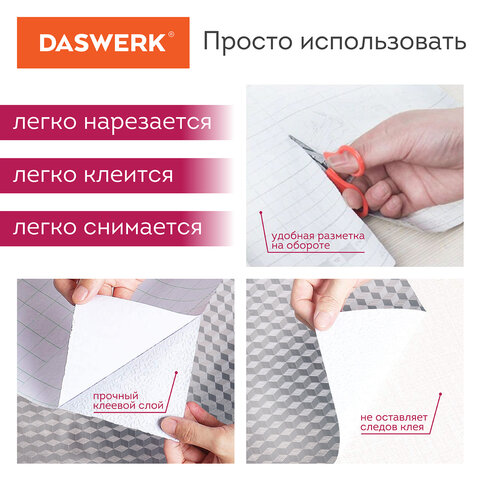 Хозяйственная самоклеящаяся плёнка DASWERK поставляется в рулонах 60 см х 3 м и будет полезной для ремонта дома или на даче - плёнка легко наклеивается на любую гладкую и чистую поверхность и обеспечивает защиту от брызг масла, от жира, от пятен, а также от царапин и других механических повреждений. Подходит для оклеивания столешниц, зон вокруг плиты или в качестве кухонного фартука. Содержащийся в составе алюминий придает плёнке противогрибковые свойства, необходимые для защиты полок под раковиной или для обувницы, также пленку можно наклеить на подоконник, в выдвижные полки или на детский столик. Благодаря своей водонепроницаемости плёнка очень проста в уходе - достаточно протереть сухой или влажной салфеткой. Плёнка выдерживает температуру до 170°С (без воздействия прямого огня), не боится горячих жидкостей и позволяет ставить на неё горячие предметы. На обратной стороне нанесена разметка для удобства нарезания на фрагменты требуемого размера. Универсальная плёнка может быть использована для самых разных целей, например, в качестве подарочной упаковки или декоративного элемента в интерьере.