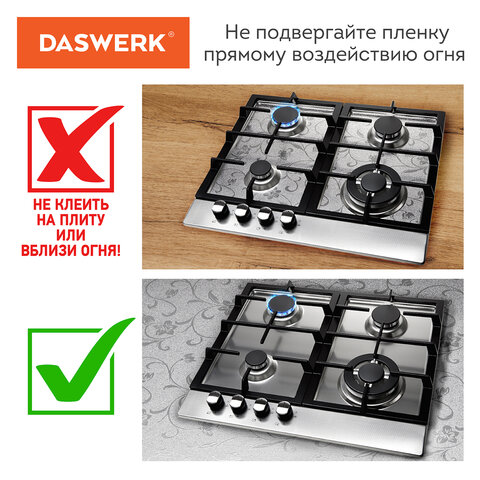 Самоклеящаяся плёнка DASWERK из прочного композитного материала с содержанием алюминия не впитывает воду, масла, жиры и эффективно используется в качестве защитного или декоративного покрытия для кухни и других рабочих зон.