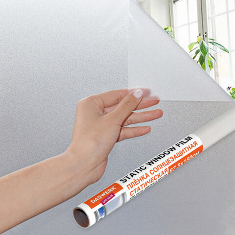 Плёнка на окно DASWERK поставляется в рулоне шириной 67,5 см и длиной 1,5 м. Плёнка подходит для установки на комнатные и балконные окна, стеклянные двери и перегородки, дверцы шкафов и полок, а также дверцы и перегородки душевых кабин. Оконная пленка не затемняет помещение, пропуская 75% солнечного света и тепла, в то же время, отражая 75% ультрафиолетового излучения, плёнка защищает предметы мебели и интерьера от выгорания и потери внешнего вида. Лицевая поверхность имитирует матовое стекло, украшая и подчёркивая интерьер, а также защищая от любопытных взглядов.