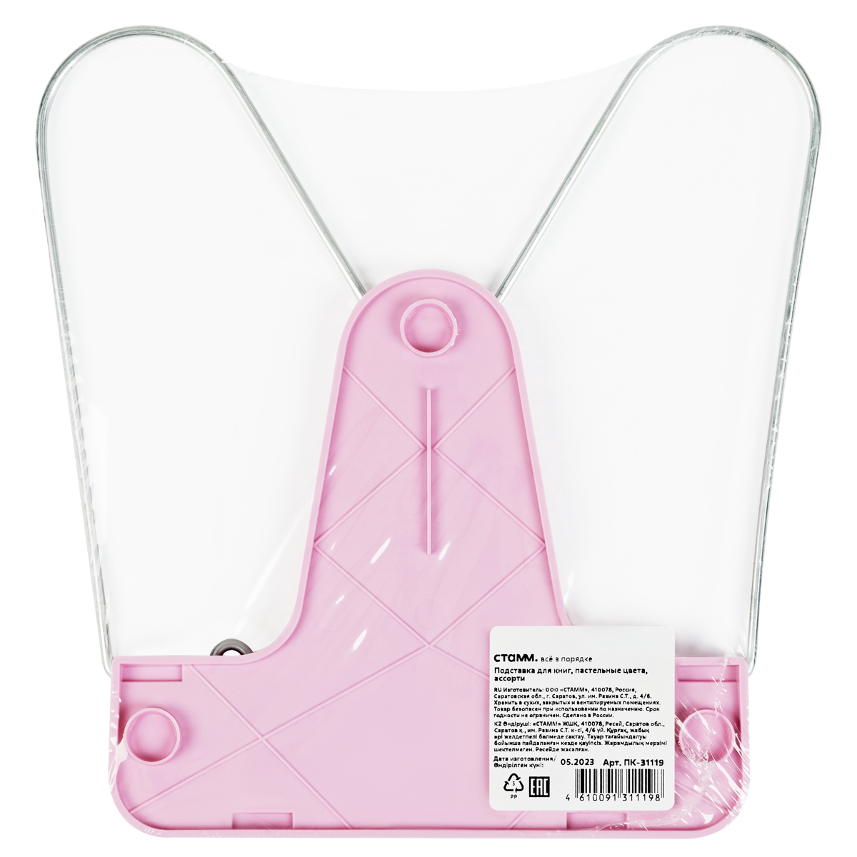 Подставка для книг «СТАММ» – школьный аксессуар, повышающий комфорт при чтении. Изделие размером 193*203*15 мм подходит для больших и малых форматов книг. Корпус изделия изготовлен из пластика и металла. Благодаря наличию фиксатора подставка не складывается под тяжестью книги. Угол наклона регулируется от 110 до 130 градусов. Складная конструкция удобна при транспортировке и хранении. Использование подставки поможет сформировать правильную осанку.<br/>• Размер: 193*203*15 мм;<br/>• Цвет: ассорти пастельных цветов;<br/>• Материал: металл/пластик.