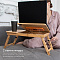 Столик-трансформер из бамбука подойдет для ноутбука, планшета или завтрака в постель. Изготовлен из высококачественного натурального бамбука сорта MOSO. Это экологичный, долговечный, антисептический материал. Классический дизайн столика хорошо впишется в любой интерьер. Телескопические ножки позволяют регулировать высоту столика от 20 до 27 см. Регулируемую часть столешницы можно установить под необходимым для комфортной работы наклоном. Благодаря столику для ноутбука снижается нагрузка на мышцы спины и шеи. Наличие на фиксированной части столешницы специального углубления даёт возможность разместить на ней стакан или кружку. Специальные отверстия на регулируемой части столешницы осуществляют отвод тёплого воздуха от ноутбука/планшета, а 2 USB вентилятора обеспечат охлаждение ноутбука и предотвратят его перегрев. Столик станет отличным подарком для родных, друзей и коллег. Вес 1,95 кг.