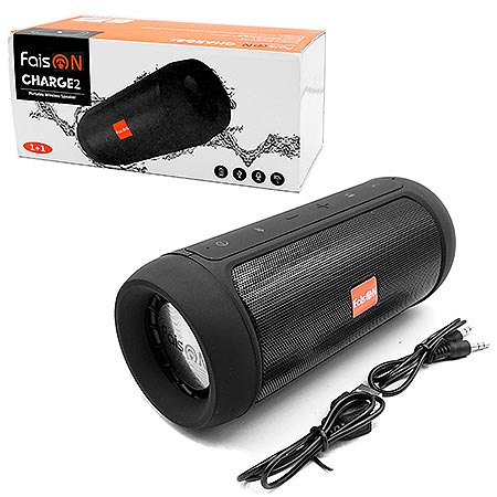 Колонка портативная " FaisON " Charge 2 черная, беспроводная, пластик, Bluetooth, AUX, microSD, кабель Jack 3,5мм, кабель для зарядки USB, 15Вт, 80*185мм