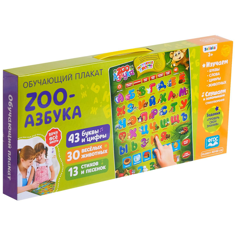 У плаката есть обучающие, музыкальные и игровые кнопки, кнопки включения/выключения и регулировки громкости, 10 кнопок с цифрами, 33 с буквами русского алфавита, а также кнопки с интересными заданиями.<br/>«ZOO Азбука» умеет:<br/>воспроизводить названия букв и цифр;<br/>произносить слова по слогам;<br/>проигрывать задорные песенки;<br/>рассказывать стихи.<br/>Также обучающий плакат будет давать ребёнку различные задания, по которым он должен найти правильный ответ.<br/>Вместе с этой увлекательной игрушкой чадо изучит цифры, алфавит, разовьёт память, воображение, логику, визуальное и слуховое восприятие, моторику рук, весело и с пользой проведёт время.