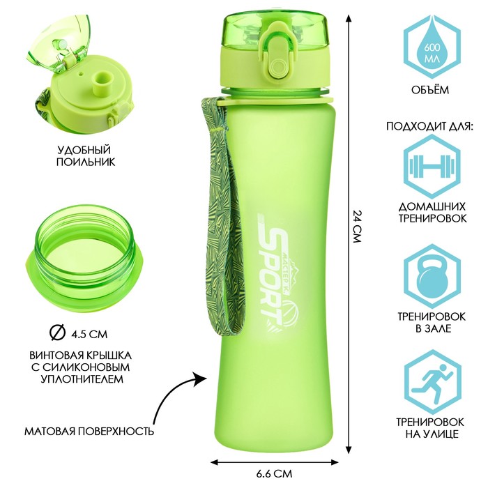 Бутылка для воды, 600 мл, SPORT, с поильником, зеленая