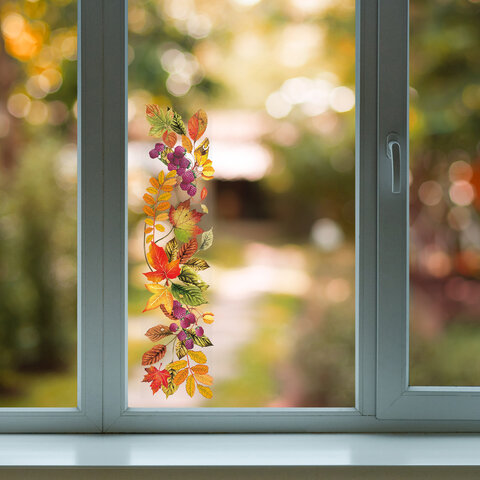 Изделие с осенним тематическим изображением представляет собой наклейку на окно/стекло, изготовленную из поливинилхлорида (ПВХ). Наклейка размером 14,8х59 см декорирована разноцветным глиттером. Украшение предназначено для декорирования окон, зеркал, стекол и других ламинированных глянцевых поверхностей. Не оставляет клеевых следов и предназначено для многократного использования. Крепится к поверхности посредством статического эффекта. Украшение на белой картонной подложке упаковано в прозрачный полипропиленовый пакет на картонном подвесе.