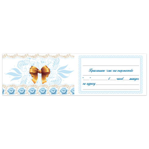 Изготовлено из высококачественного картона плотностью 215 г/м2. Выполнено в белом цвете, с орнаментом и золотистым бантом. Для удобства предоставлен блок информации, куда можно вписать необходимые данные: адрес и время проведения торжества. Размер - 70х120 мм (в развороте 70х240 мм).