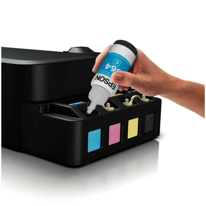 Фабрика печати Epson L120 – самый доступный по цене принтер данной серии. Кроме того он отличается самыми компактными размерами из всей линейки устройств «Фабрика печати» благодаря новой конструкции чернильных емкостей, вмещающих по 40 мл. чернил каждого цвета. За счет отсутствия картриджей Фабрика печати Epson L120 позволяет печатать цветные документы с рекордно низкой себестоимостью и является идеальным решением для пользователей, которым нужна максимально экономичная, но вместе с тем качественная печать. Расходными материалами к Epson L120 служат стандартные контейнеры с чернилами серии C13T664 емкостью по 70 мл. каждый. Таким образом не смотря на то что емкости у данного устройства вмещают по 40 мл. чернил себестоимость печати на нем такая же, как на других 4-ех цветных моделях серии Фабрика печати Epson – всего 20 коп. за цветной документ формата А4. В Epson L120 используются чернильные емкости нового поколения. Теперь для заправки чернил не требуется отсоединения емкостей от корпуса – все, что вам нужно это открыть герметичную крышку и залить чернила. Кроме того новая конструкция позволяет транспортировать устройство без использования герметичных заглушек и транспортировочного клапана.