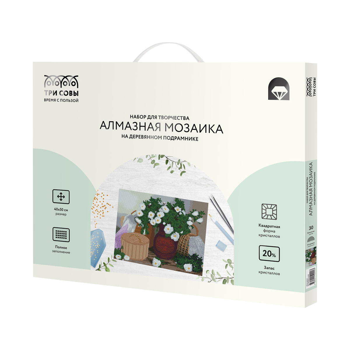 Алмазная мозаика «ТРИ СОВЫ» – увлекательное занятие, которое дарит умиротворение и гармонию, развивает усидчивость, аккуратность и внимательность. Вы сможете создать своими руками оригинальную, мерцающую на свету картину.<br/><br/>В набор входят:<br/>• холст на деревянном подрамнике с цветной схемой картины, покрытый клеевым слоем и защищенный специальной пленкой;<br/>• квадратные акриловые кристаллы. Каждый цвет упакован в удобный пакет с замком-застежкой;<br/>• металлический пинцет для захватывания кристаллов;<br/>• пластиковый стилус с 2 наконечниками, который позволяет захватывать от 1 до 3 кристаллов;<br/>• силиконовая подушечка;<br/>• лоток для кристаллов;<br/>• крепления на стену. <br/><br/>«ТРИ СОВЫ» – время с пользой!<br/><br/>• Количество цветов: 30<br/>• Уровень сложности: 5