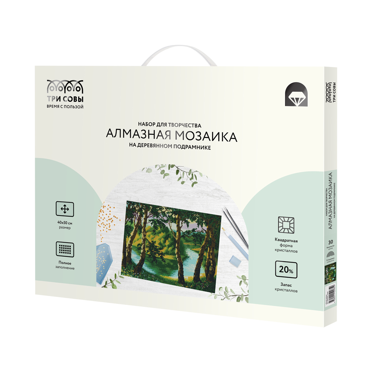 Алмазная мозаика «ТРИ СОВЫ» – увлекательное занятие, которое дарит умиротворение и гармонию, развивает усидчивость, аккуратность и внимательность. Вы сможете создать своими руками оригинальную, мерцающую на свету картину.<br/><br/>В набор входят:<br/>• холст на деревянном подрамнике с цветной схемой картины, покрытый клеевым слоем и защищенный специальной пленкой;<br/>• квадратные акриловые кристаллы. Каждый цвет упакован в удобный пакет с замком-застежкой;<br/>• металлический пинцет для захватывания кристаллов;<br/>• пластиковый стилус с 2 наконечниками, который позволяет захватывать от 1 до 3 кристаллов;<br/>• силиконовая подушечка;<br/>• лоток для кристаллов;<br/>• крепления на стену. <br/><br/>«ТРИ СОВЫ» – время с пользой!<br/><br/>• Количество цветов: 30<br/>• Уровень сложности: 5
