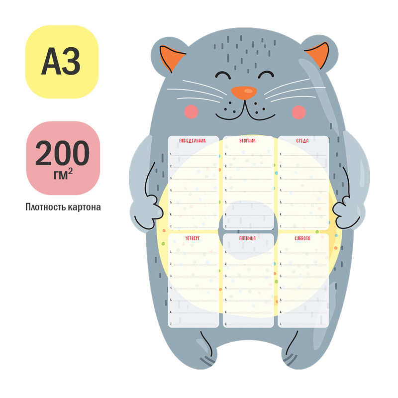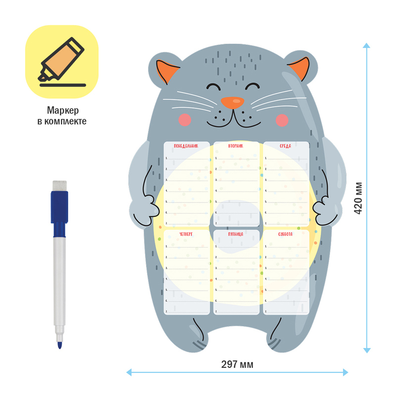 Магнитный планер для расписания уроков ArtSpace «Пиши-Стирай. Cat» – отличный помощник в планировании школьного дня. Планер формата А3 выполнен из картона плотностью 200 г/м2 с ламинацией и магнитного винила. Размер магнитного расписания – 297*420 мм. В комплекте прилагается маркер на магните со стирателем, которым очень удобно корректировать записи и крепить его к любой металлической поверхности (например, к холодильнику). Расписание рассчитано на 6-дневную рабочую неделю, по 7 уроков в день. Универсальный оригинальный дизайн понравится мальчикам и девочкам.<br/>Комплект упакован в индивидуальный пакет с клеевым краем. В упаковке представлена 1 штука.<br/>• Формат: А3;<br/>• Размер: 297*420 мм;<br/>• Материал: картон, магнитный винил;<br/>• Плотность картона: 200 г/кв. м;<br/>• Пол: универсальный.