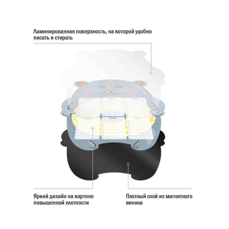 Магнитный планер для расписания уроков ArtSpace «Пиши-Стирай. Cat» – отличный помощник в планировании школьного дня. Планер формата А3 выполнен из картона плотностью 200 г/м2 с ламинацией и магнитного винила. Размер магнитного расписания – 297*420 мм. В комплекте прилагается маркер на магните со стирателем, которым очень удобно корректировать записи и крепить его к любой металлической поверхности (например, к холодильнику). Расписание рассчитано на 6-дневную рабочую неделю, по 7 уроков в день. Универсальный оригинальный дизайн понравится мальчикам и девочкам.