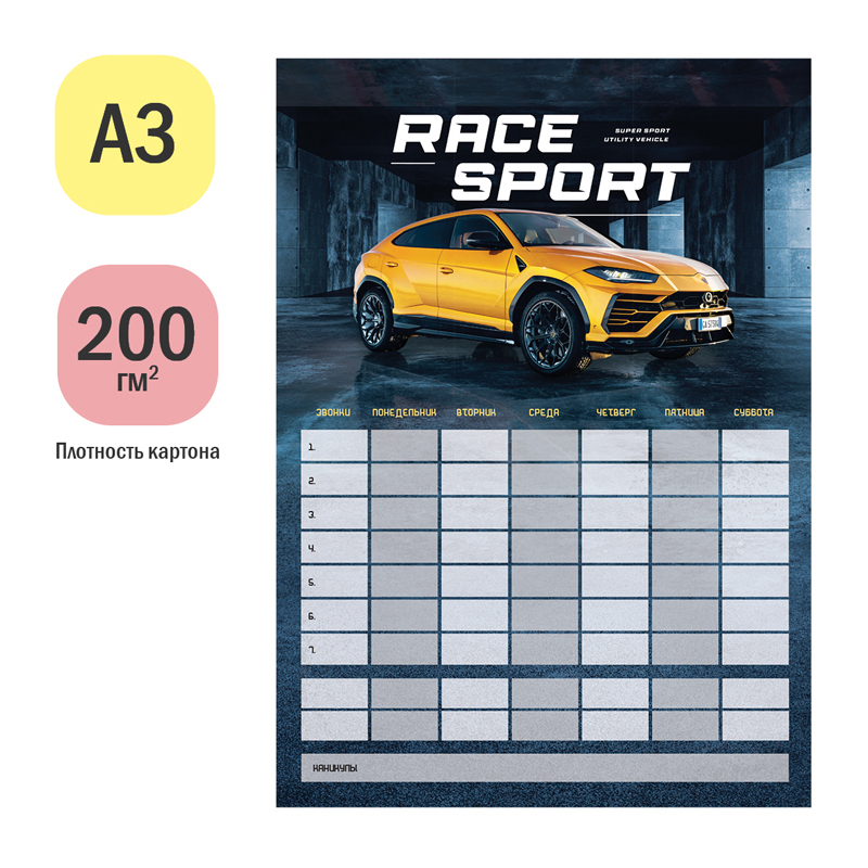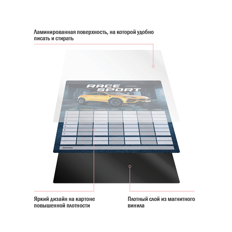 Магнитный планер для расписания уроков ArtSpace «Пиши-Стирай. Race Sport» – отличный помощник в планировании школьного дня. Планер формата А3 выполнен из картона плотностью 200 г/м2 с ламинацией и магнитного винила. Размер магнитного расписания – 297*420 мм. В комплекте прилагается маркер на магните со стирателем, которым очень удобно корректировать записи и крепить его к любой металлической поверхности (например, к холодильнику). Расписание рассчитано на 6-дневную рабочую неделю, по 7 уроков в день. Спортивный дизайн особенно понравится мальчикам.<br/>Комплект упакован в индивидуальный пакет с клеевым краем. В упаковке представлена 1 штука.<br/>• Формат: А3;<br/>• Размер: 297*420 мм;<br/>• Материал: картон, магнитный винил;<br/>• Плотность картона: 200 г/кв. м;<br/>• Пол: мужской.