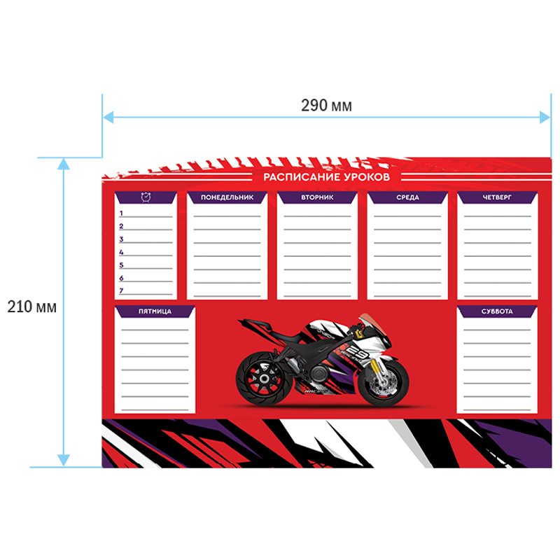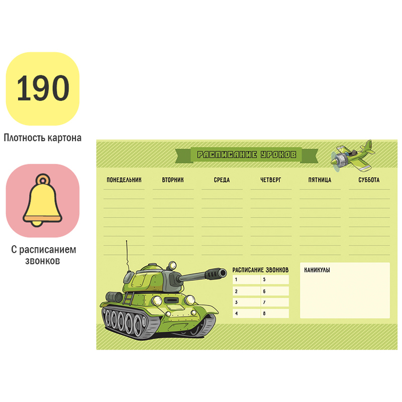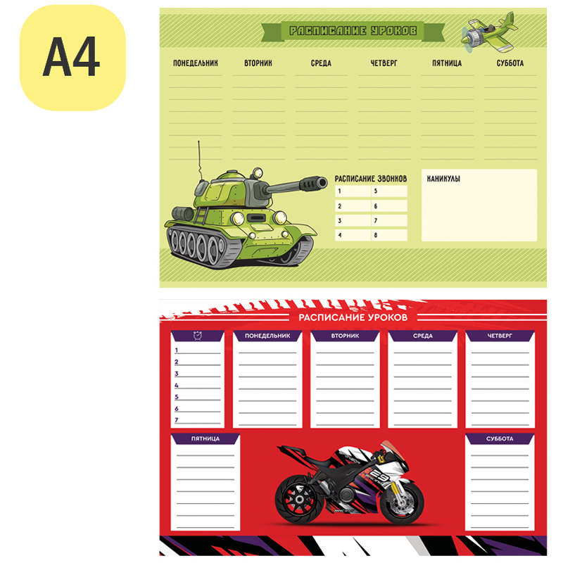 Чтобы правильно составить распорядок дня и рационально распределить время ребенка, необходимо определиться, какие элементы должны быть в нем отражены. Прежде всего это время на учебу в школе и подготовку домашнего задания в домашних условиях. В вопросе школьного планирования идеально подходит многоразовое расписание уроков ArtSpace "Пиши-стирай".<br/>Для письма рекомендуем маркеры или фломастеры на водной основе (в набор не входят). Ламинированная поверхность позволяет вносить изменения и правки.<br/>Включает блок "Расписание звонков".<br/>Выполнено из плотного картона 190 г/м2 с глянцевой ламинацией.<br/>Ассорти из 2 дизайнов (10+10).<br/>Транспортная упаковка: гофрокороб или крафт бумага по 600шт.