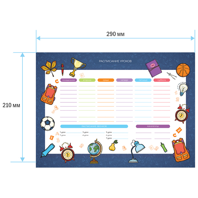 Чтобы правильно составить распорядок дня и рационально распределить время ребенка, необходимо определиться, какие элементы должны быть в нем отражены. Прежде всего это время на учебу в школе и подготовку домашнего задания в домашних условиях. В вопросе школьного планирования идеально подходит расписание уроков ArtSpace. Включает блок "Расписание звонков".<br/>Выполнено из плотного картона 190 г/м2<br/>Ассорти из 2 дизайнов (10+10).<br/>Транспортная упаковка: гофрокороб или крафт бумага по 600шт.
