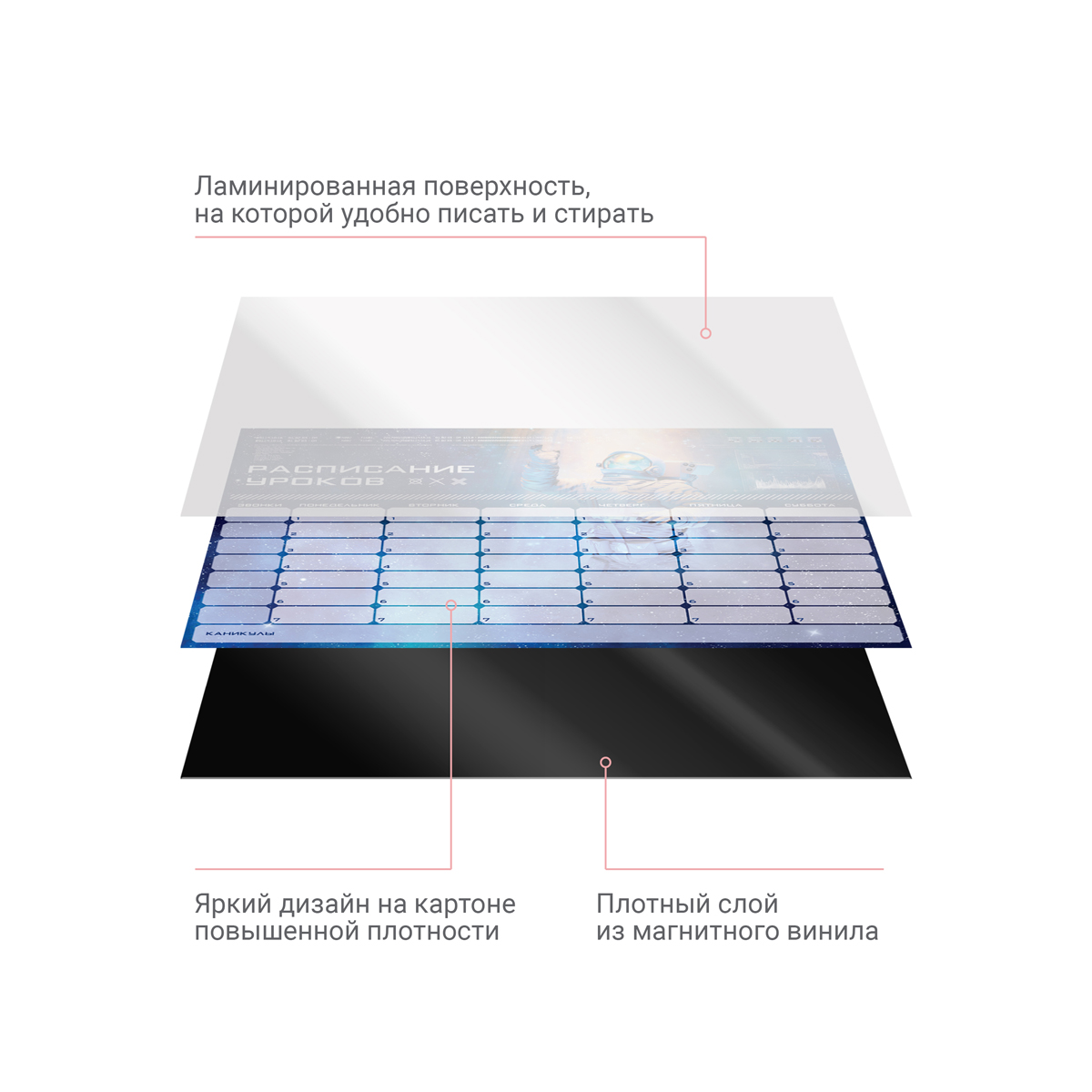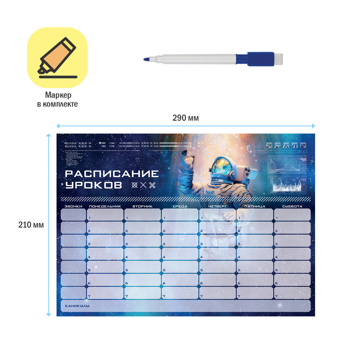 Многоразовый магнитный планер ArtSpace «Пиши-Стирай. Космос» поможет школьнику придерживаться распорядка дня, рационально распределять нагрузку. Изделие формата А4 (210*290 мм) сделано из картона плотностью 200 г/м2 с ламинацией и магнитного винила. Глянцевая поверхность позволяет многократно вносить в расписание изменения при помощи маркера на магните со стирателем, который входит в комплект. Он крепится к любой металлической поверхности, например, к холодильнику. <br/>Расписание рассчитано на шестидневную учебную неделю. Каждый день включает семь уроков. В планере есть специальные блоки для расписания звонков, благодаря которым родители будут в курсе точного времени начала и окончания занятий. Предусмотрен блок с расписанием каникул. Дизайн планера с космонавтом понравится мальчику. Комплект упакован в индивидуальный пакет с клеевым краем.<br/>• Формат: А4;<br/>• Размер: 210*290 мм;<br/>• Материал: картон, магнитный винил;<br/>• Плотность картона: 200 г/м2;<br/>• Пол: мужской.
